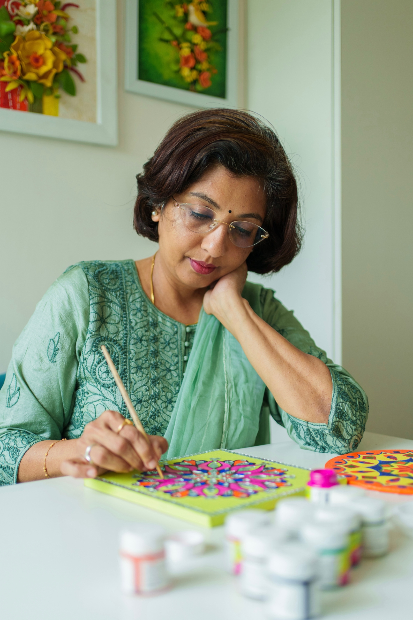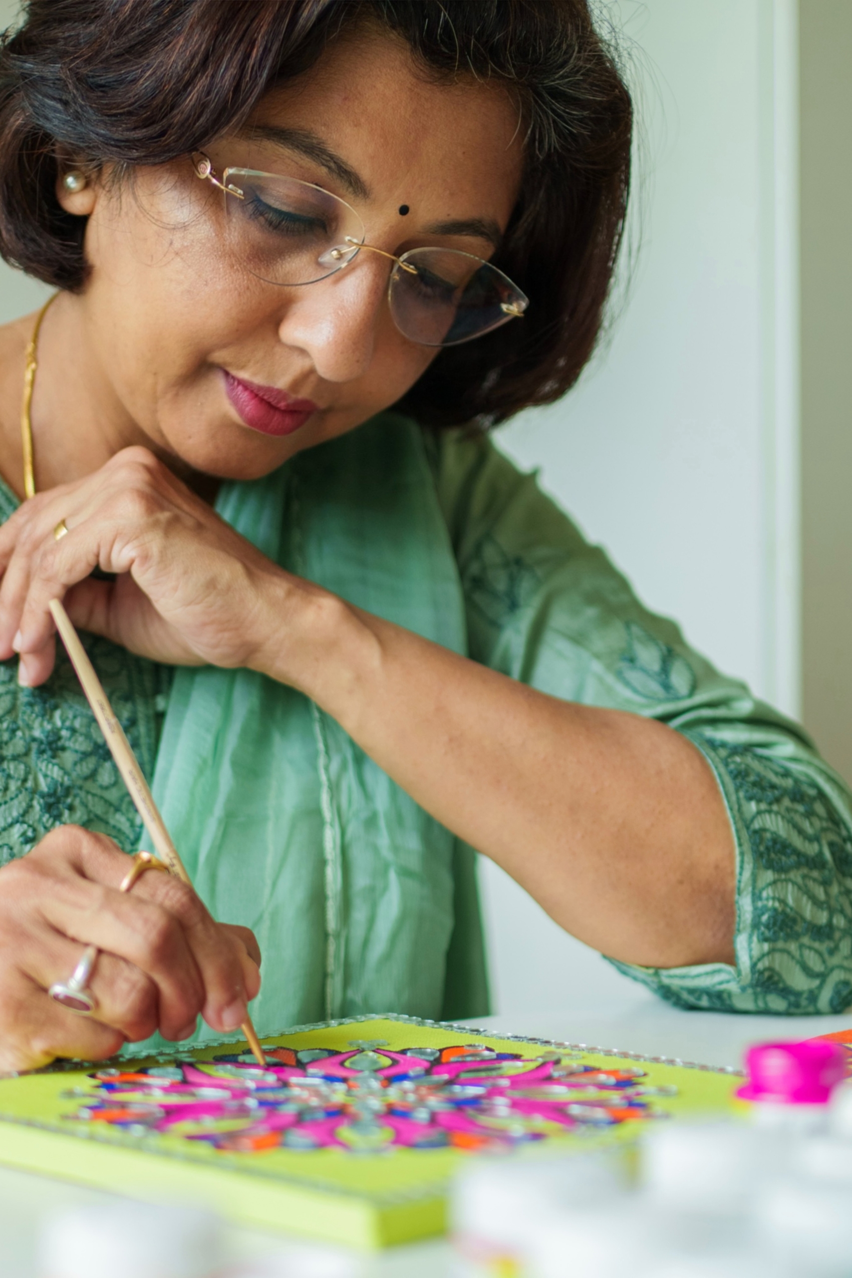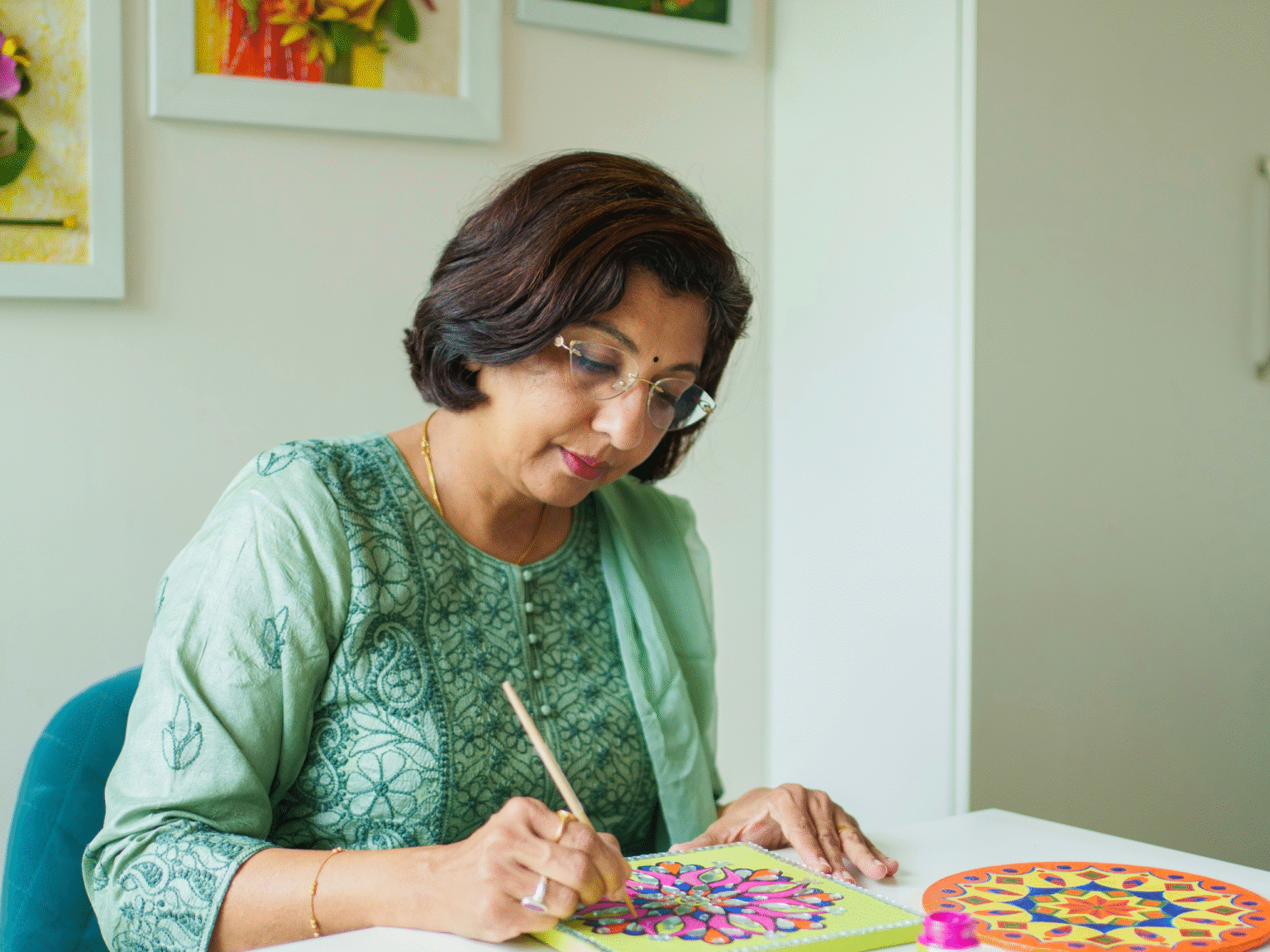 This vision grew further through the Happy Art Project, bringing mandala-based activities into schools and communities to help children improve focus, regulate emotions, and cultivate happiness. The work extends beyond traditional drawing and painting, embracing innovative forms such as paper craft and mixed-media approaches while remaining rooted in Vedic wisdom.
